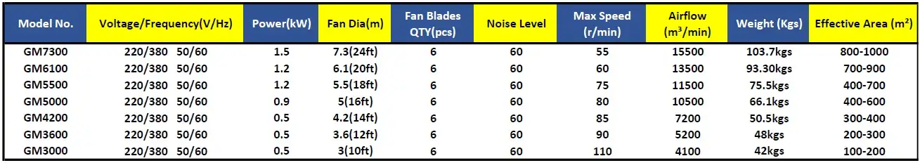 | Model No. | Voltage/Frequency(V/Hz) | Power(kW) | Fan Dia(m) | Fan Blades QTY.(pcs) | Max Speed (r/min) | Airflow(m³/min) | Effective Area(㎡) |